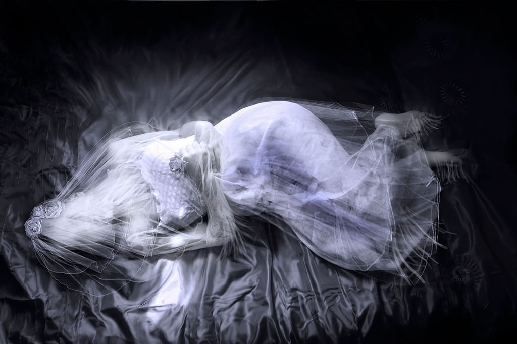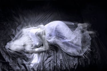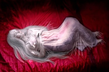 In the first photograph, I placed my subject on crimson fabric, her white form still holding some semblance of life despite the beginnings of abandonment. I chose red deliberately, it represents the emotional world I was leaving behind, the last flashes of feeling before the numbness set in. The figure lies suspended between vitality and surrender, much as I felt caught between my former self and what I was becoming.