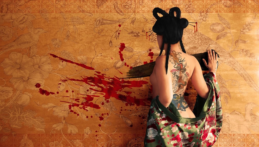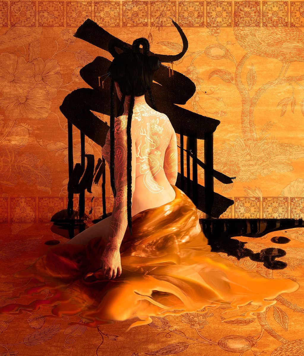 The first image speaks to the visceral nature of this connection. My back turned, vulnerable yet adorned with a powerful dragon tattoo, a symbol of the strength I thought this relationship gave me. The blood spatters across the golden wallpaper represent the very real emotional wounds that came with loving someone I couldn't touch. The kimono sliding from my shoulders shows how I willingly exposed myself emotionally, while my traditional hairstyle and the ornate background reflect how I elevated this relationship to something ancient and fated.