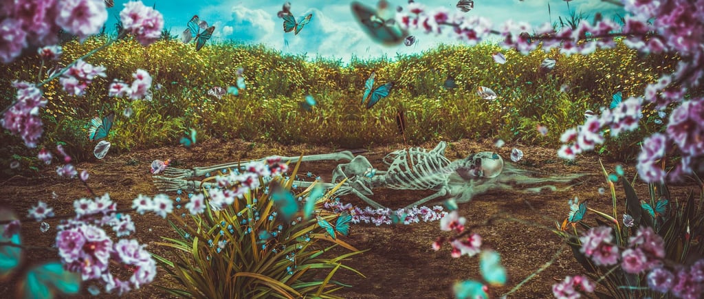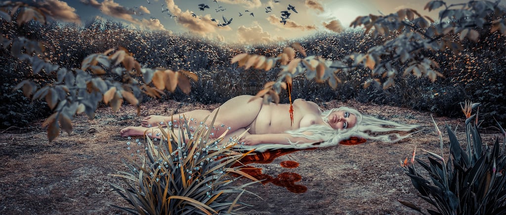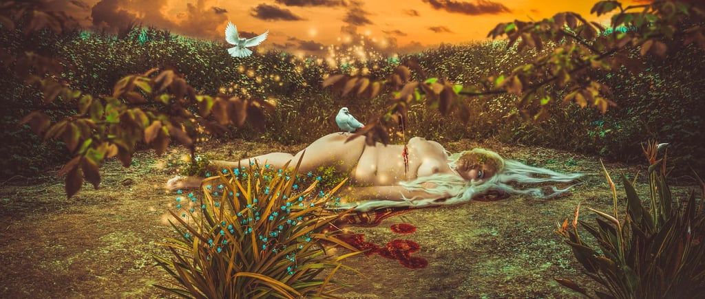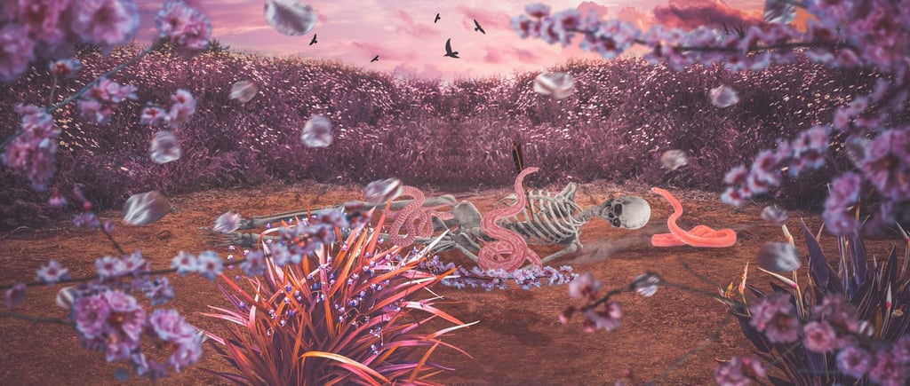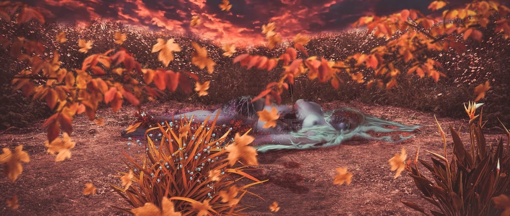 I present the decomposition of a female body in nine stages, from the beginning of this woman's death to her 'total' disappearance. I use japonism as an art style as an inspiration to better represent what I want to express.