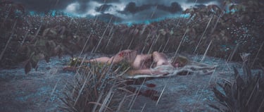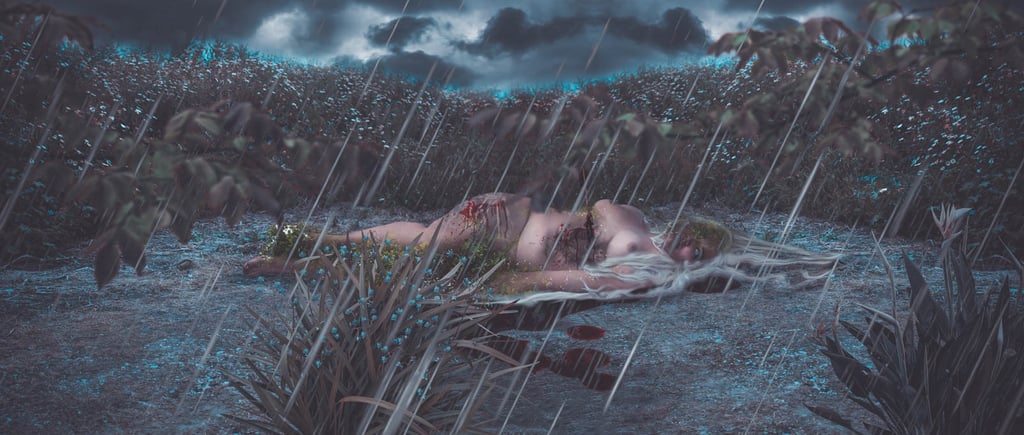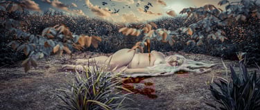For the composition of the decomposition, several photographic images were merged to become a single image. I photographed the background where I live and made some nude self-portraits, I used photographic elements, one in 3D and some digital brushstrokes in Photoshop, to simulate the decomposition of this “woman”.